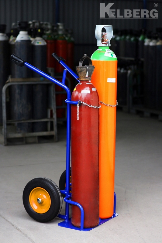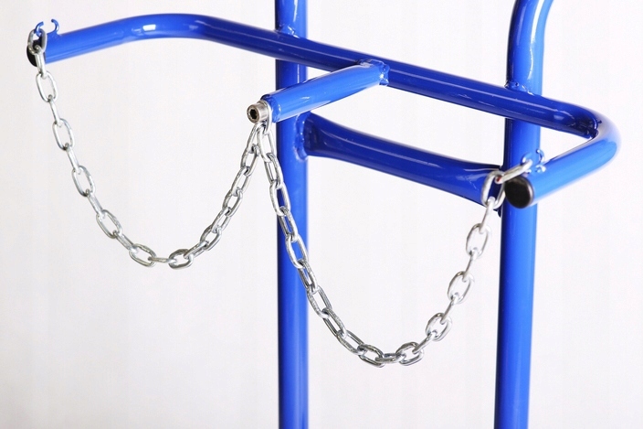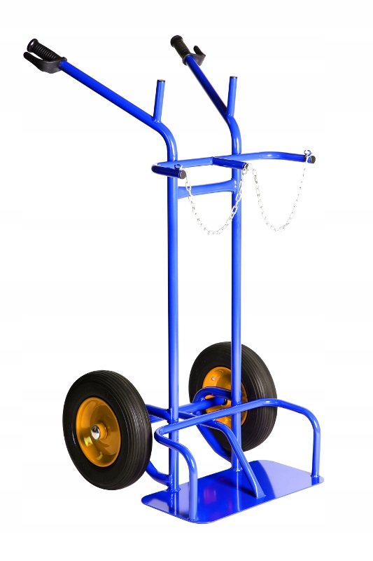 Комфортний і стійкий візок для транспортування двох великих балонів. Він має страхувальні ланцюги, платформу з роздільниками та тримач шланга.