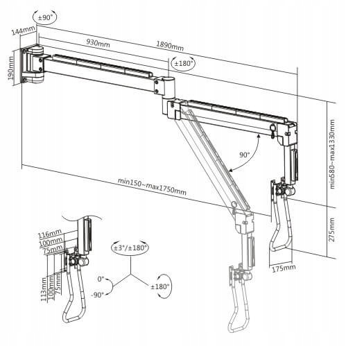 Власник стін для монітора SPA-G370 надає вам повну свободу налаштування. Діапазон нахилу можливий у діапазоні 0-90 градусів, тоді як діапазон обертання -+180 ° ~ -180 °. Таке ж значення, тобто +180 ° ~ -180 °, має обсяг обертання екрана. Більше того, максимальна довжина руки - 1780 мм. Завдяки цьому ви можете встановити своє робоче місце, як хочете.