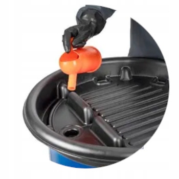 забезпечує ефективний потік рідких залишків до бочки. Завдяки унікальній конструкції він покриває всю поверхню, а похилі стіни керуються навіть щільними та липкими речовинами безпосередньо всередині. Виготовлений з хімічно стійкого поліетилену (PE) забезпечує зручність та надійне використання.