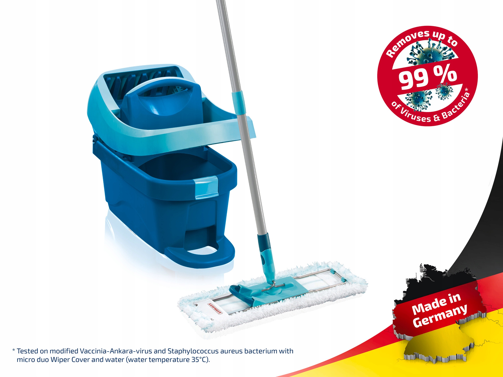 Кінець замочування рук у брудній воді. Набір відрів з пресуванням Mopa Profi Micro Duo від Leifheit з колесами, що включає відро Profi з нанесеним пресом та Micro Mop Profi дозволить очистити сухими руками і без необхідності згинатись вниз. Це так просто: вийміть накладку з ручки стопою і покладіть у стислу, а потім стисніть стопою і без використання сили - готова. Накладка настільки ж суха, як і після того, як вручну відкручують. Підлога буде висохнути в мить ока. Мікро-дует MOP Profi, включений у набір MOP Profi з 3-частинною сталевою паличкою, ретельно миє всі поверхи. Завдяки тонкому, накладка, виготовлена з двох типів волокон, досягне найменших порожнин і ретельно видалить навіть постійний бруд. Крижанку можна промивати в пральній машині від 60 ° С до 400 разів, не втрачаючи властивостей очищення. Велика ширина накладання швабри - 42 см - економить багато кроків і цінний час. Блискучий обертовий суглоб на 360 ° дозволяє ефективно мити зигзагом і навколо ніг столів та шафи з відром із пресом, тепер оснащений двома легко обертовими колесами, розміщеними безпосередньо в нижній частині відра. Складні часи палички