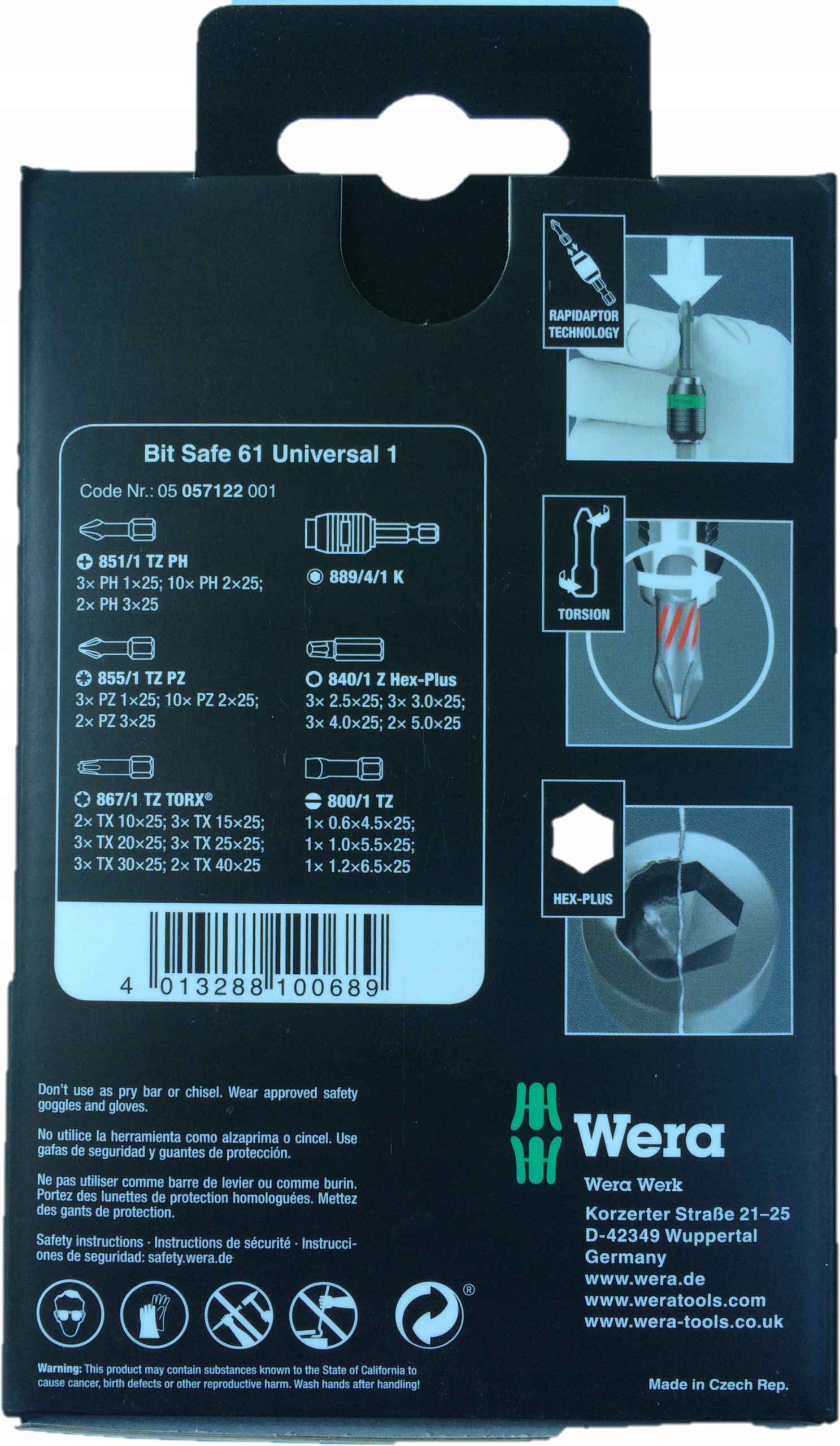 Набір біт із 61 частини в міцній касеті Bit-Safe. Набори Bit-Check дозволяють швидко переглядати доступні інструменти. Невикористані насадки поміщаються назад у касету, що виключає ризик їх втрати. 1 універсальний тримач з технологією Rapidaptor: наконечник можна прикріпити без переміщення стопорного кільця. Інструмент змінюється переміщенням стопорного кільця вперед, що дозволяє швидко працювати однією рукою. Постійний магніт для надійного утримання інструменту. Для кріплення у викрутку або тримач електронного дриля.