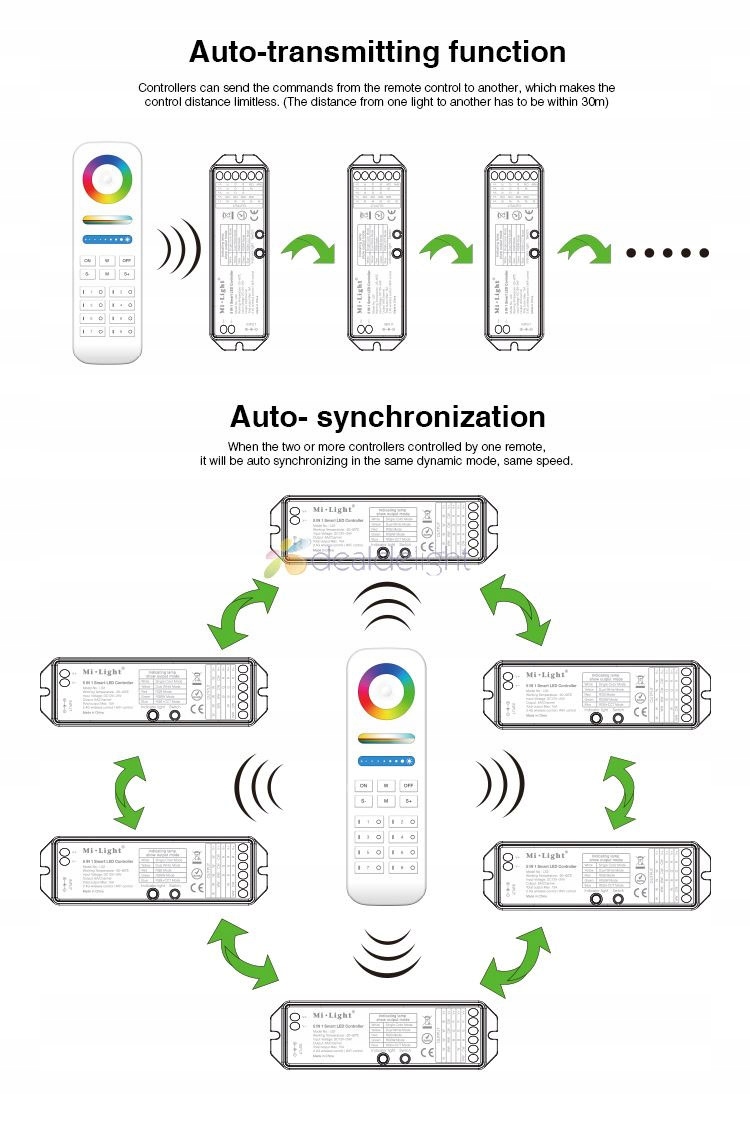 Корисна функція для освітлювальних установ, яка включає більшу кількість приймачів, керованих одним трансляційним пристроєм. Система спільно синхронізується під час роботи, без перешкод у роботі та без затримки.