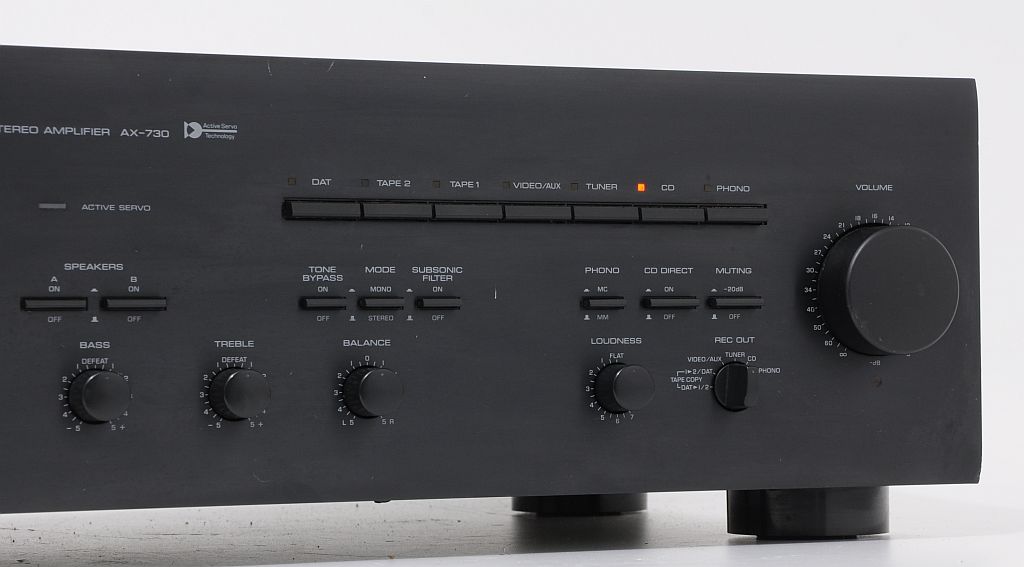 Звичайно, у нас багате обладнання. Можна підключити вертушок (підтримуються як MM, так і MC вставки), три джерела з лінійним рівнем та до трьох стрічкових рекордерів. AX-730 також має вихід попереднього підсилювача та вхід підсилювача живлення. Зазвичай вони компактно прикріплені до перемички, але можна використовувати кожну частину окремо. Підсилювач має два кольорові регулятори. Контур також регулюється. Крім того, додаткове обладнання доповнюється селекторами виводу динаміків, виходом навушників, регулятором балансу каналів, вибором джерел запису, фільтром Subsonics та моностерео-перемикачем.