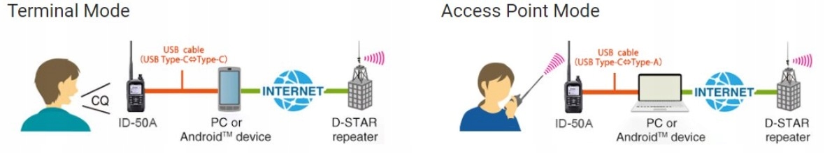 Icom ID-50E має можливість підключатися до Інтернету через комп’ютер з Windows або пристрій Android. Це дозволяє (за допомогою режиму терміналу та режиму точки доступу) радіостанція надавати доступ до мережі ретранслятора D-STAR навіть із місць, де немає прямого доступу до ретранслятора D-STAR.