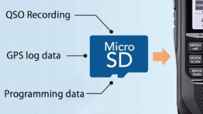 Картка MicroSD (до 32 ГБ) може зберігати записи QSO, голосову пам’ять TX, фотографії, QSO та дані журналу GPS.
