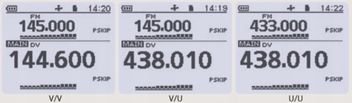 Функція Dualwatch дозволяє одночасно контролювати діапазони VHF/VHF, VHF/UHF і UHF/UHF. Ви можете швидко відповісти на дзвінок з основного та піддіапазону. (Не працює в режимі DV/DV).