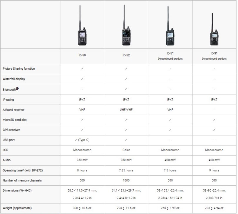 Порівняльна таблиця портативних радіостанцій Icom D-STAR: