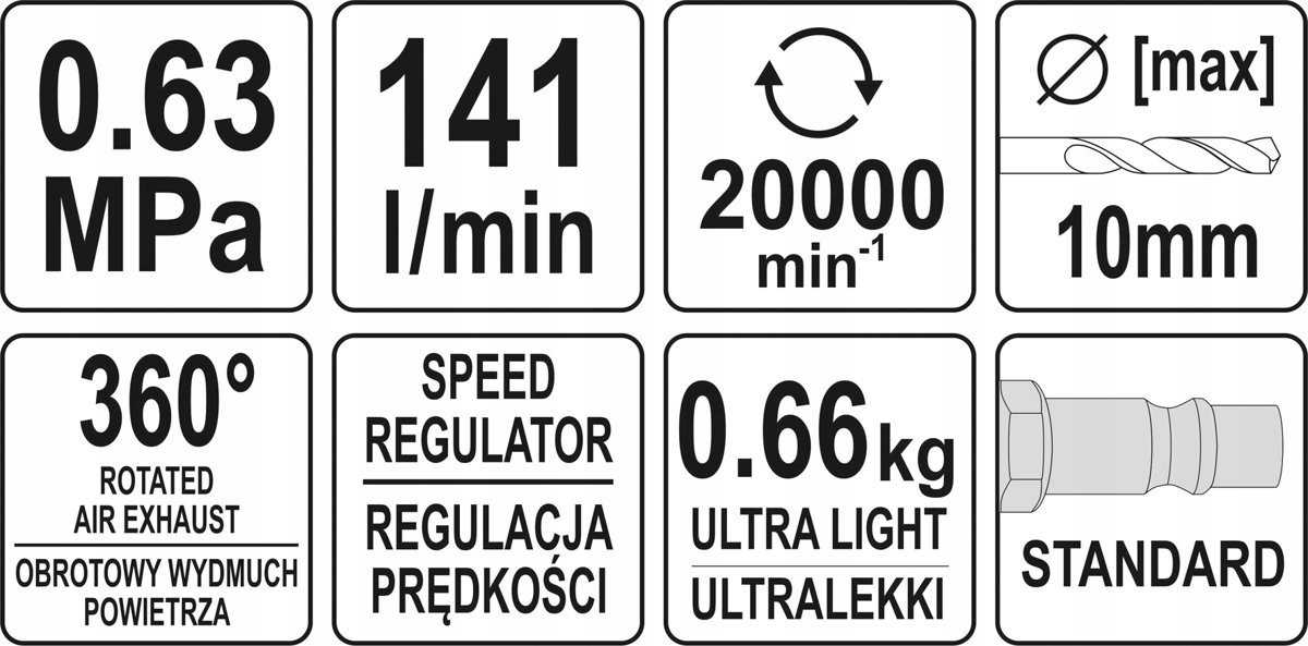 Професійна пневматична дриль, що працює від потоку стисненого повітря під тиском. Призначений для свердління в металі, дереві, пластмасі та коли необхідне свердління без удару. Він ідеально підходить для приміщень з обмеженим простором для маневру. Використовується в автомобільному сервісі та промисловості.