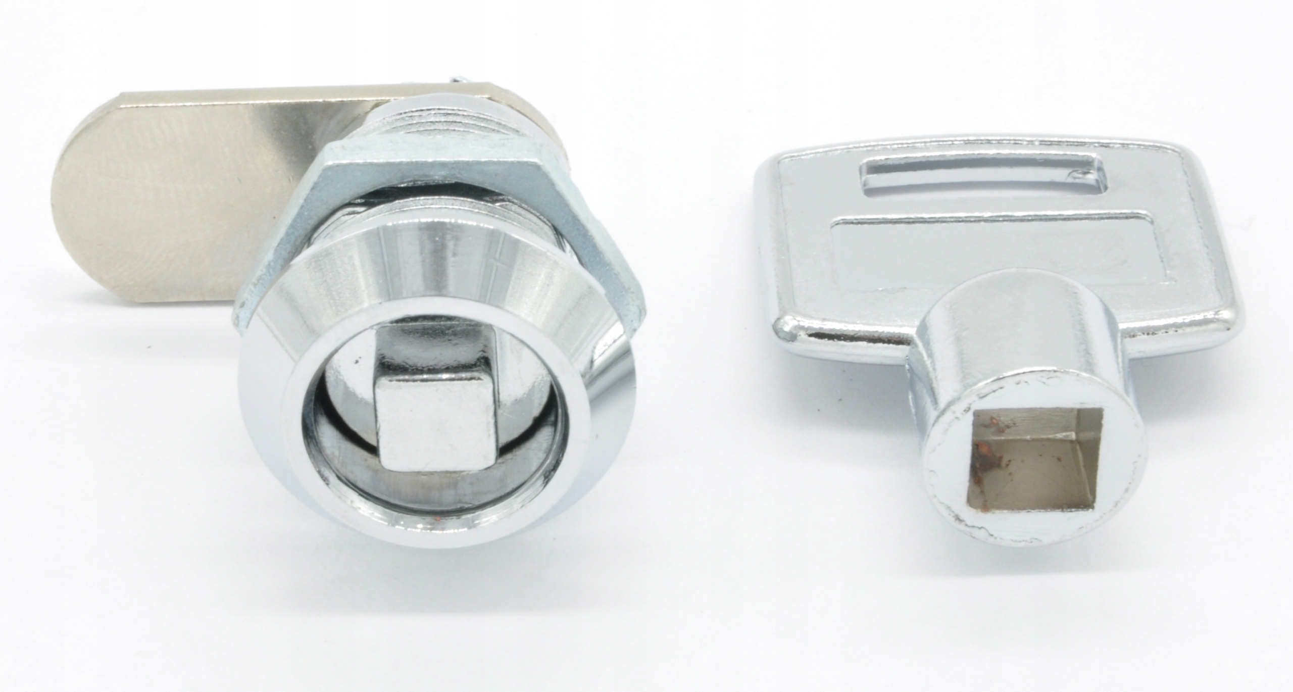 Опис: високоякісний замок з оцинкованого сріблястого металу. Лицьова сторона замка, видима з боку ключа, нікельована. Має 1 квадратний ключ. Закривання та відкривання замку передбачає натискання ключа та його поворот на 90 градусів. Закриваючим елементом є металевий язичок. Замок фіксується кріпильною гайкою. Язичок встановлюється на квадратний штифт і кріпиться до корпусу замка гвинтом. Замок може бути встановлений як в дерев'яну, так і в металеву конструкцію.