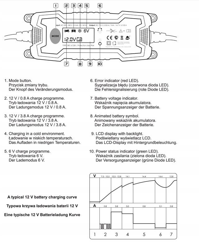 - Автоматичне та надійне управління зарядом акумулятора - після досягнення певної напруги або автоматичного зменшення струму зарядки ; b> батареї, які можуть виникнути під час зарядки; > Режим "Реактивація/реанімація " - Спеціальна зарядка режиму - У випадку з надзвичайно звільненими акумуляторами зарядний пристрій використовує обмежений струм зарядки з одиночними імпульсами, поки безпечна напруга не досягне швидшого зарядки - зарядний пристрій вирішить необхідність використовувати Цей режим; Перед перегрівом, перевантаженням, перевантаженням тощо