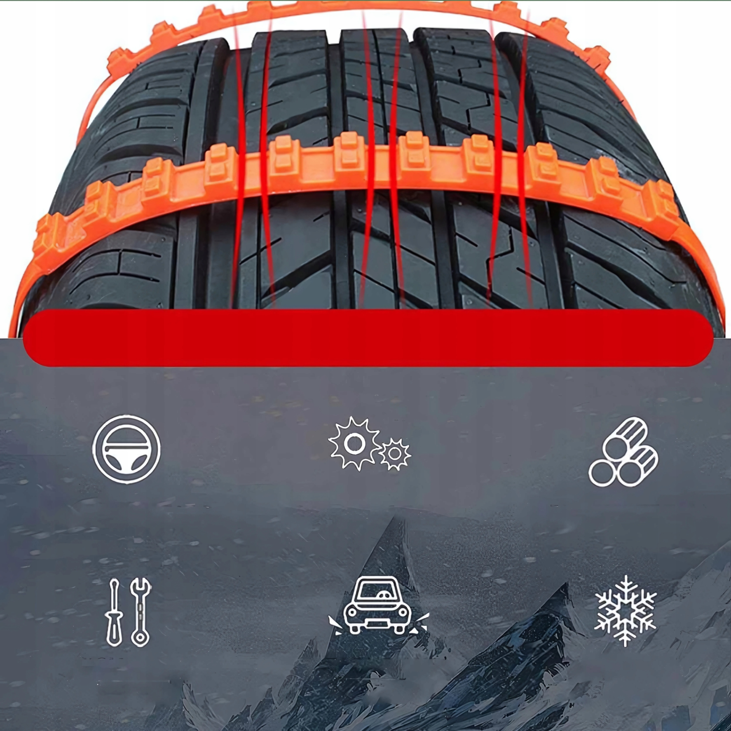 ✅ безпека дорожнього руху - збільшити адгезію у складних умовах, таких як сніг, грязь або слизька поверхня. > ✅ простота використання - Легка та швидка збірка без додаткових інструментів.