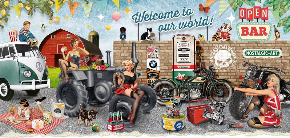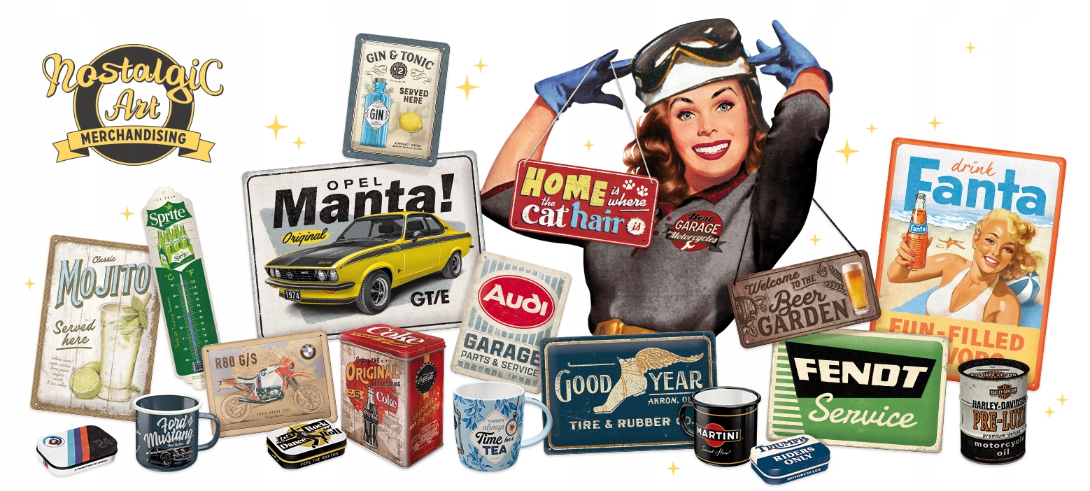 У пропозиції з ностальгічною мистецтвом все нове. Наша різноманітність продуктів з оцинкованого листа пропонує ностальгічні зображення від класичних оголошень до кінокорів та світових брендів, таких як Harley-Davidson, Coca-Cola, Persil, Volkswagen, John Deere, BMW та багато інших. Ви знайдете подарунки ретро -стилю для всіх і для кожного будинку. Наші продукти ідеально відповідають фантазійним сценаріям. Як подарунок для коханих і коханих, як вдосконалення домашнього декору, або просто як частина вашої колекції в ностальгічному стилі. Ці продукти вшановують старі часи усмішкою.