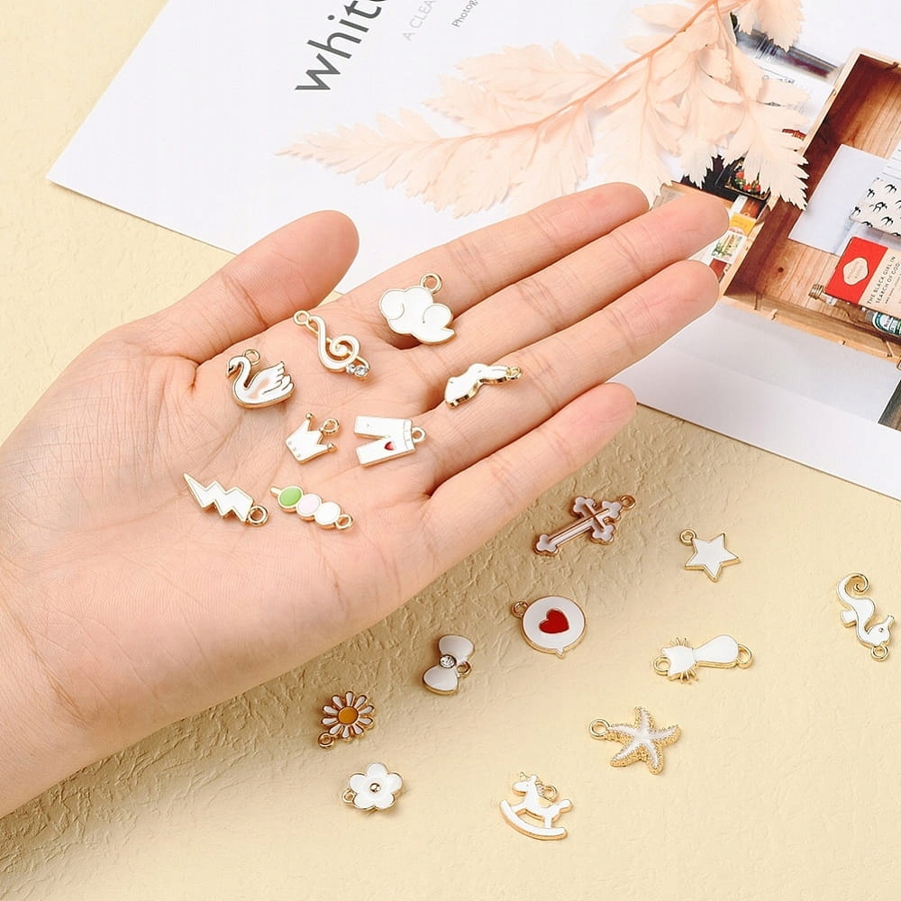 Красиві металеві підвіски, емальовані білою емалі для браслетів, ключових кілець та ювелірних виробів. 30 штук. Поєднання візерунків.