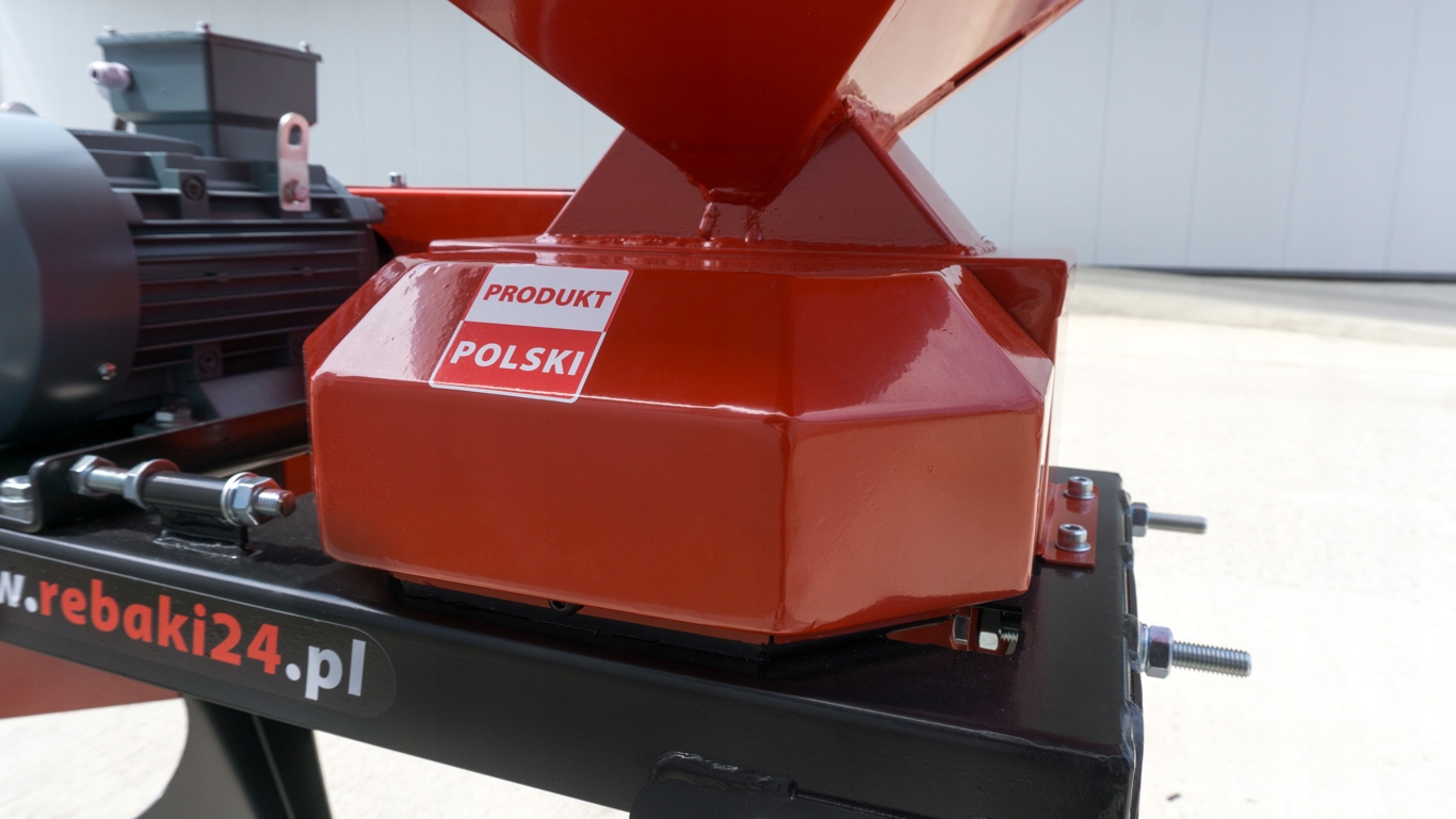 Подрібнювач має міцну та просту конструкцію, що впливає на тривалий термін служби пристрою та зручність використання. Оснащений бункером із замком, який дозволяє регулювати подачу подрібненого матеріалу, і випускним отвором, що полегшує збір обробленого матеріалу з можливістю висипання його в кошик або в мішок, підвішений на гачки. Два сталевих дробильних вальця забезпечують високу ефективність і надійність. Привід здійснюється трифазним електродвигуном потужністю 3кВт. Привід передається через 2 клинові паси до дробильних барабанів.