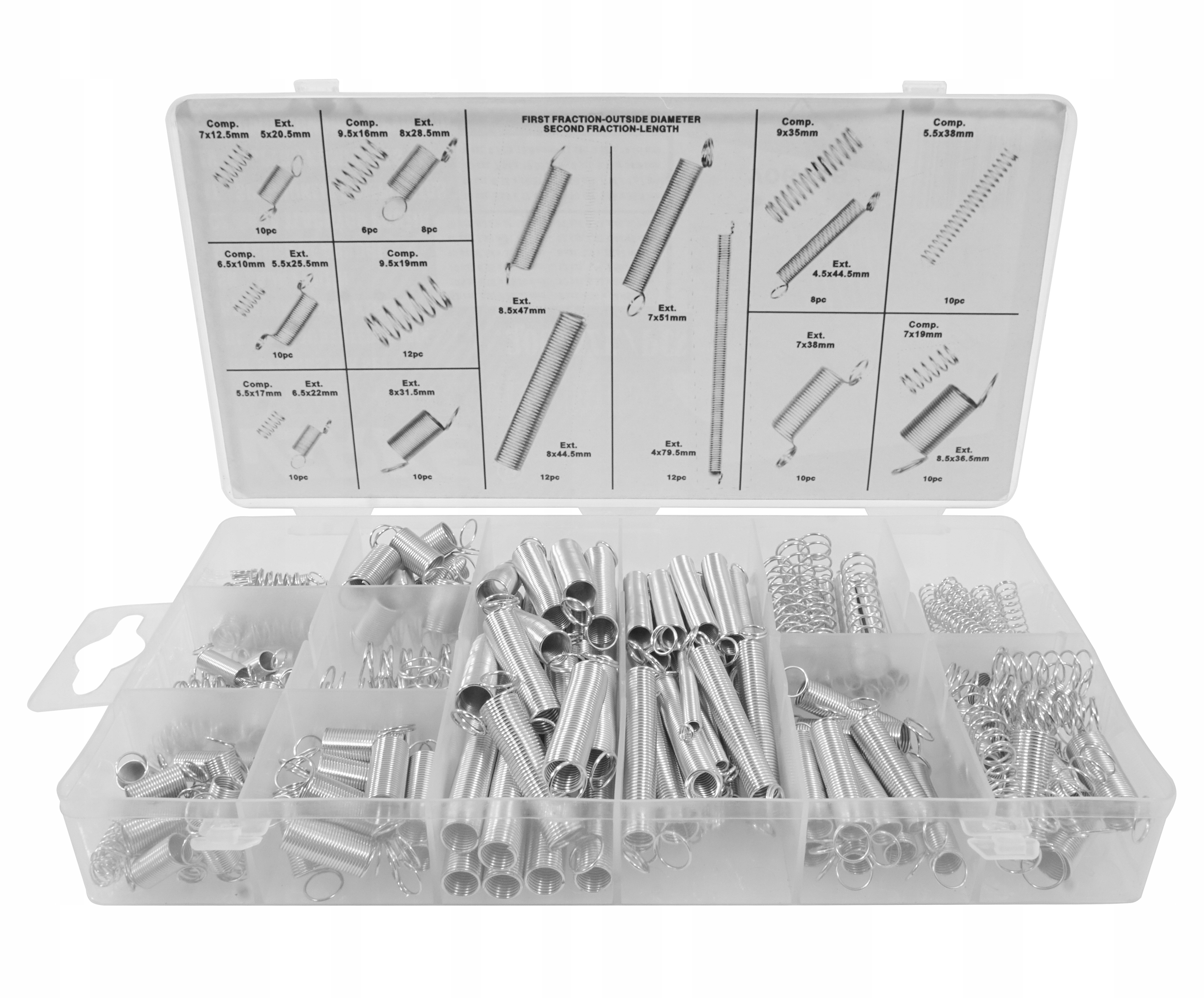 Весняний набір, що містить 200 різних розмірів. Пружини, що працюють як для стисків, так і для розтягування. Ціле розміщується у зручній "сортувальній" упаковці.