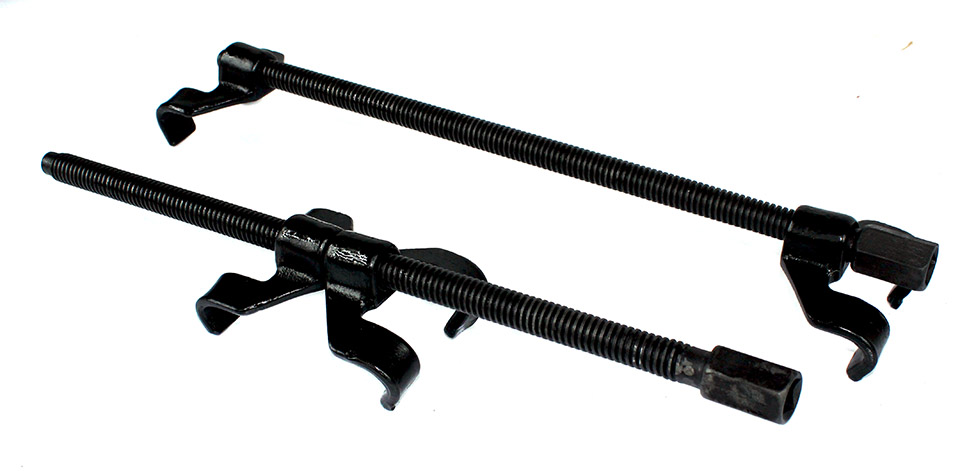 Пружинні компресори необхідні для професійного обслуговування шасі. Адаптований до всіх типів пружин у стійках McPherson і незалежних пружин. Знімач працює з тріскачкою 1/2 дюйма. Має дрібну різьбу, що полегшує роботу під навантаженням пружини. Робота безпечна завдяки спеціально профільованим двостороннім рукояткам.
