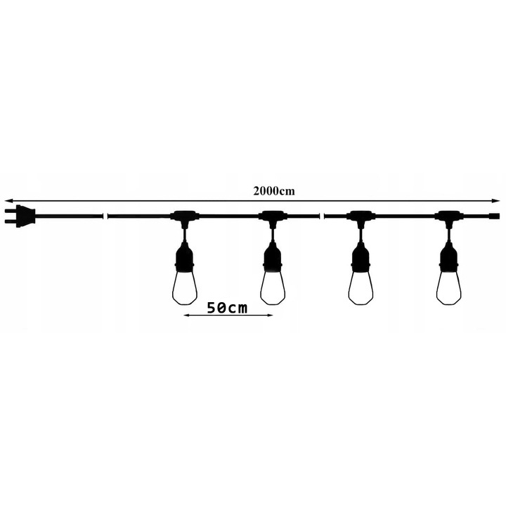 У довжині 20 м 40 розетків з лампочками E27 1W в теплому кольорі були розміщені . Перша розетка - це 60 см від штекера , наступні кожні 50 см . Поруч з кожним гніздом є отвір, який дозволяє повісити гірлянду в будь -якому місці, яке ми вибрали. Крім того, існує можливість з'єднувати гірлянди між собою, навіть створюючи одне ціле. Гніздо для розширення гірлянди становить 20 см від першої цибулини (з обох боків).