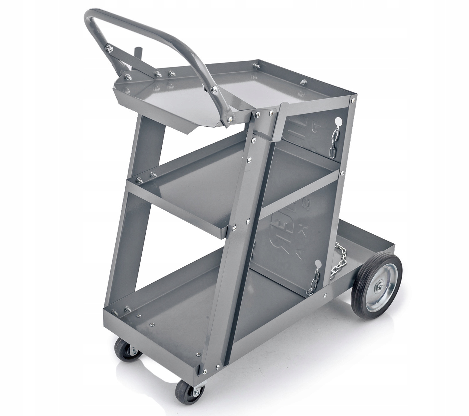 ► Верхня полиця призначена для зварювального апарату, інші дві з великою місткістю для аксесуарів. У задній частині коляски є поличка для циліндрівз двома ланцюгами для її стабілізації