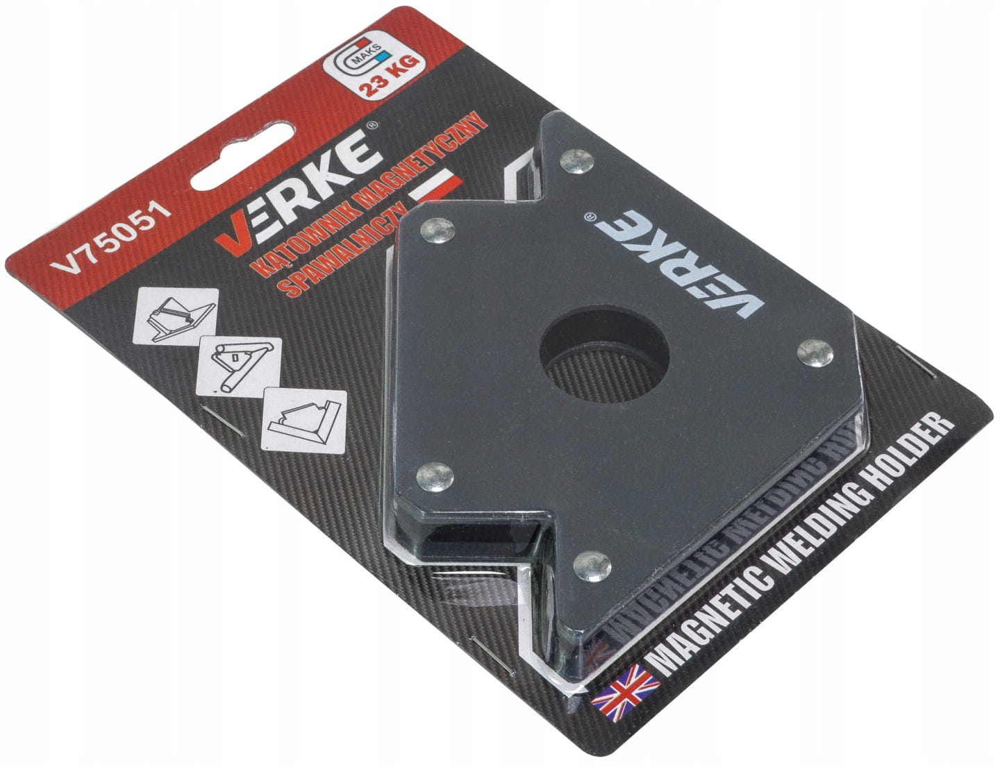 Магнітний кут, виготовлений зі сталевого листа та сильних феритових магніти. Це дозволяє точну комбінацію матеріалів під наступними кутами: 45 °, 90 ° та 135 °. Магнітна ємність прибл. 34 кг. Порошок -вірульна поверхня корпусу магніту. Розроблений для тимчасового поєднання металевих елементів при зварюванні, бурінні, лакуваннях, діяльності, що вимагають використання обох рук. Використання магнітного кута дозволяє вільно працювати з руками, і попередньо з'єднуючими, металевими елементами без допомоги додаткової людини.