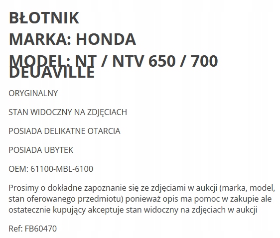 Просматривая «, Колесные арки, honda ntv 650 700 deaville», вы можете быть уверены, что данный товар из каталога «Крылья» будет доставлен из Польши и проверен на целостность. В цене товара, указанной на сайте, учтена доставка из Польши. Внимание!!! Товары для Евросоюза, согласно законодательству стран Евросоюза, могут отличаться упаковкой или наполнением.