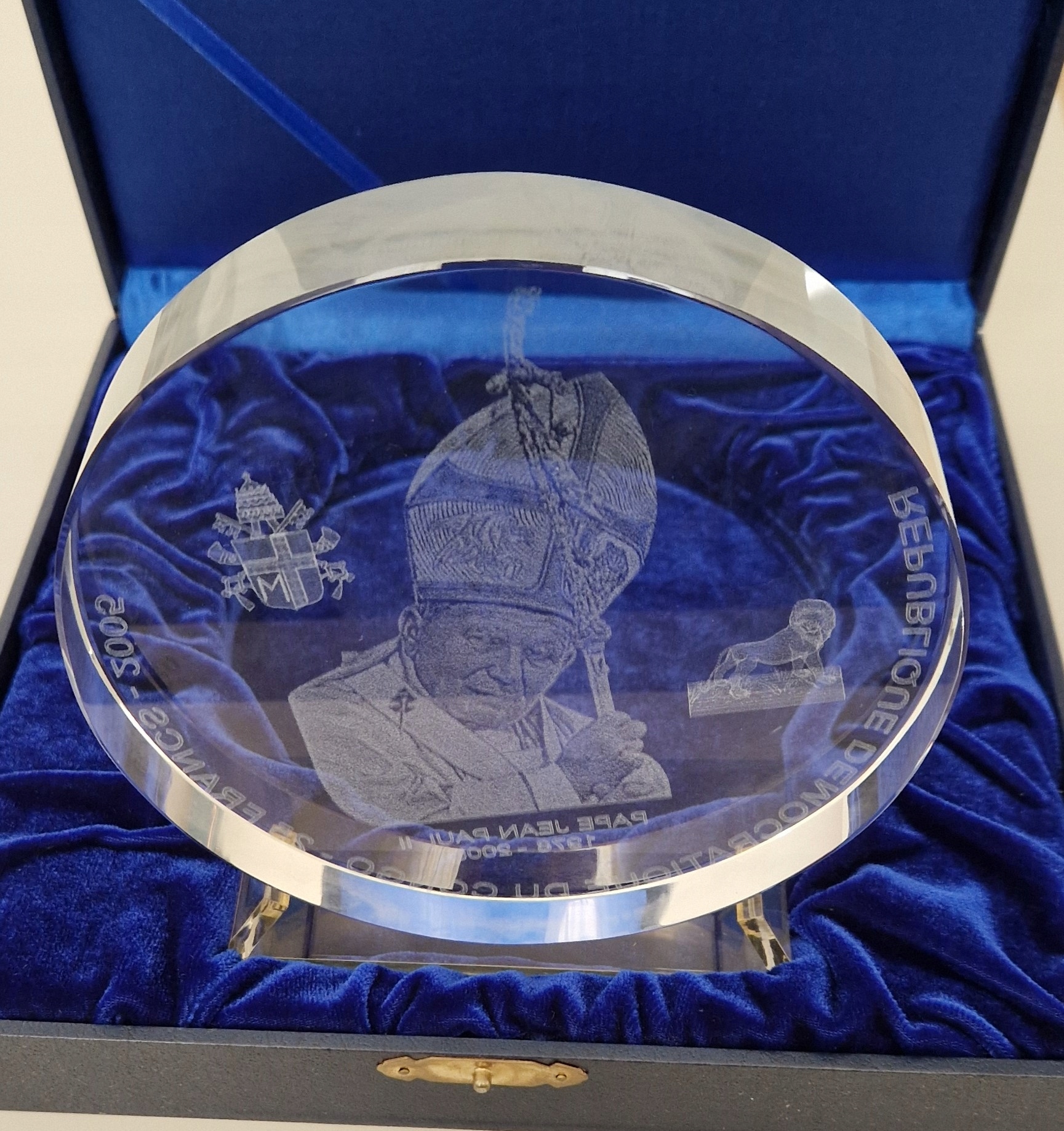 Монета представляет собой красивое изделие из акрила весом около 1 килограмма (!!!) и диаметром 14 см (!!!). Красивый портрет Иоанна Павла II, сделанный лазером. Все в коробочке, обтянутой бархатом, с сертификатом.