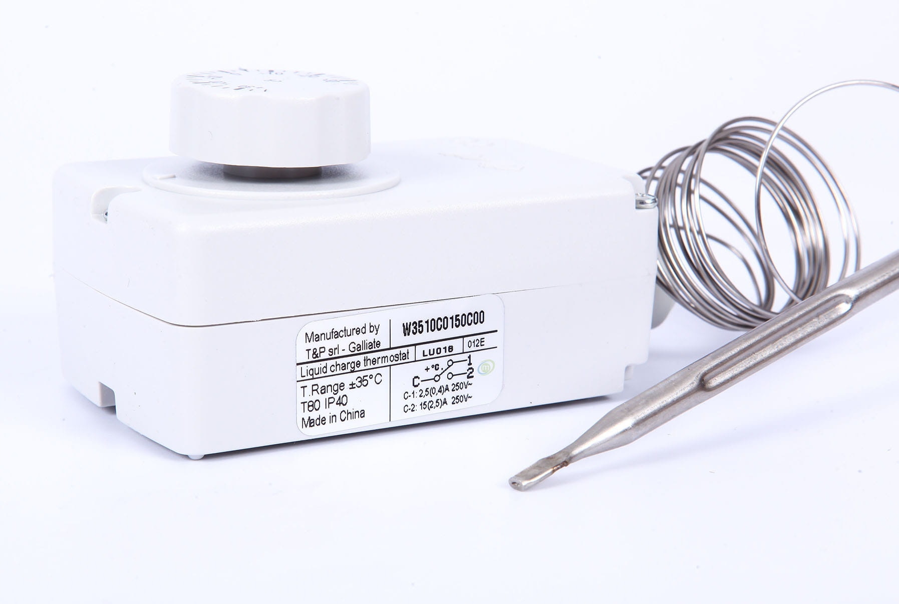 <р> Термостат W35-10H3150C00 от RANCO Он предназначен для управления в системы отопления, охлаждения и управления вентиляторы, кондиционеры и т. д. <р> Термостат благодаря капилляру позволяет разместить регулирующий компонент на некотором расстоянии от места <р> Термостат W35 оснащен измерительной головкой с газовый элемент (принцип измерения с использованием расширения газы). Имеет герметичный корпус, защищающий от влияние повышенной влажности. <р> Многофункциональный термостат с переключающим контактом SPDT автоматически открывается (функция нагрева) или замыкает (функция охлаждения) главный контакт, когда температура, считываемая измерительной лампочкой, достигает значения настройки. Затем, когда температура упадет ниже значения разница переключения, контакт замыкается (функция нагрева) или размыкается (функция охлаждения).Данные технический: Пузырь измерение: латунь никелированный; Φ6,5 мм х 112 мм Длина капилляры с мерной колбой: 1500 мм Диапазон регулирование: -35°С ... +35оС Разница соединения: <3°С Точность: ±3°С Система контакты: SPDT - переключающий контакт (C-1 нагрев или C-2 охлаждение) Нагрузка контакт: С-2 15(2,5)А 250В~ C-1 2,5(0,4)А 250В~ Установка: настенный Срок службы: 100 000 циклов Сопротивление изоляция: >100 МОм Степень защита: IP40 Соединения электрический: витой/вилка плоский 6,3мм х 0,8мм (ФАСТОН)