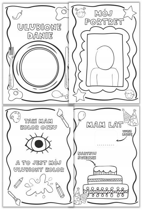 На следующих страницах ребенок дополняет информацию о себе, своих любимых вещах и интересах посредством собственных рисунков.