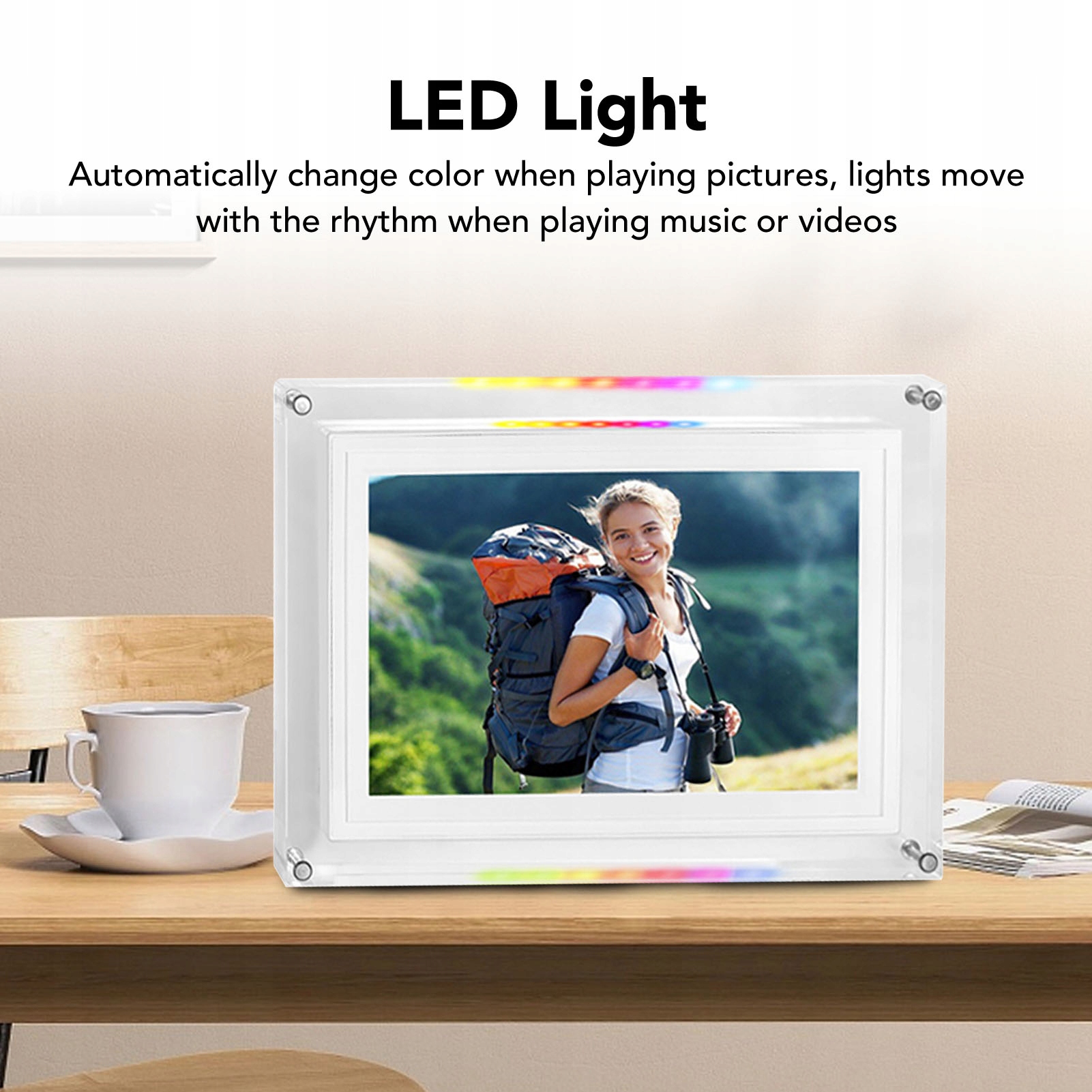 1. Динамическое светодиодное освещение: оснащено встроенными светами, изменяющими цвета светодиодов, эта цифровая рамка изображения автоматически меняет цвета при отображении изображений и синхронизируется с ритмом при воспроизведении музыки или фильмов, улучшая атмосферу в комнатах и создавая неверный аудиовизуальный впечатление.