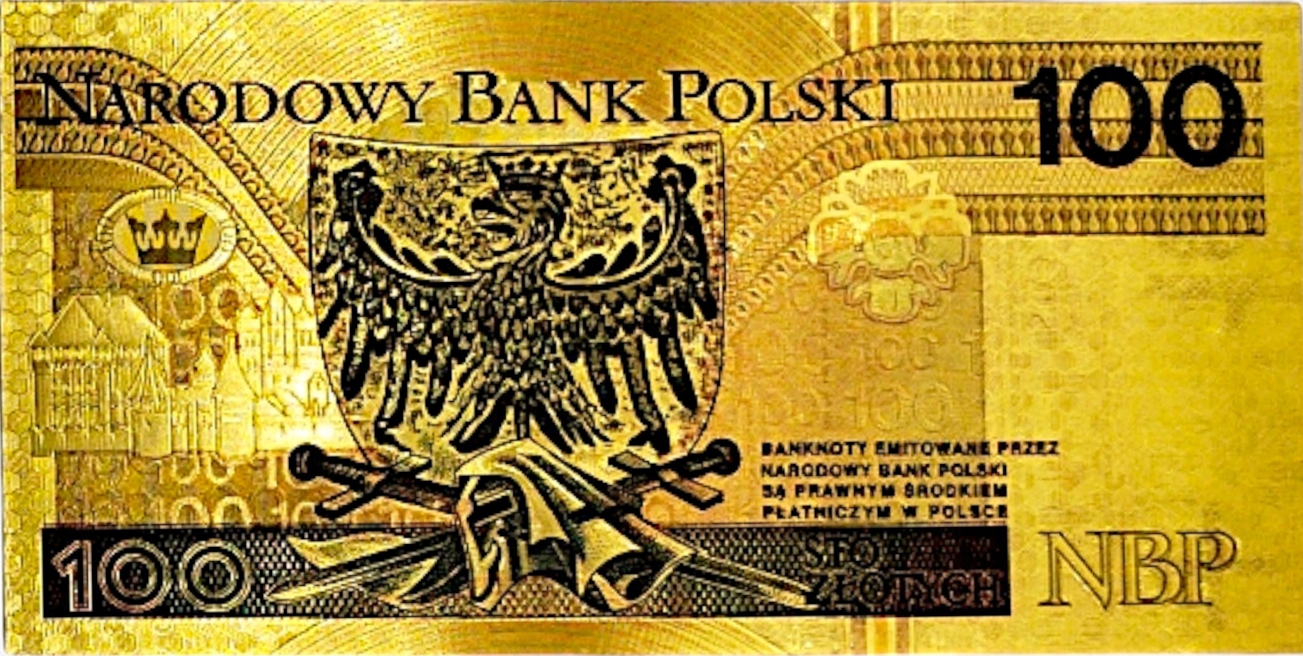 Красивая копия банкноты польского обращения номиналом 100 злотых, изготовленная из ПВХ и покрытая золотой фольгой.