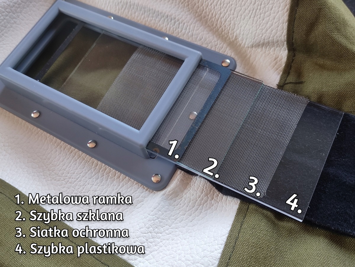 Стеклянная линза предназначена для дополнительной защиты оригинальной пластиковой линзы, помещенной в маску. Запрещается использовать только оконные стекла. Первая линза со стороны глаза представляет собой пластиковую линзу, затем защитную сетку, затем стеклянную линзу и, наконец, металлическую затягивающую оправу.