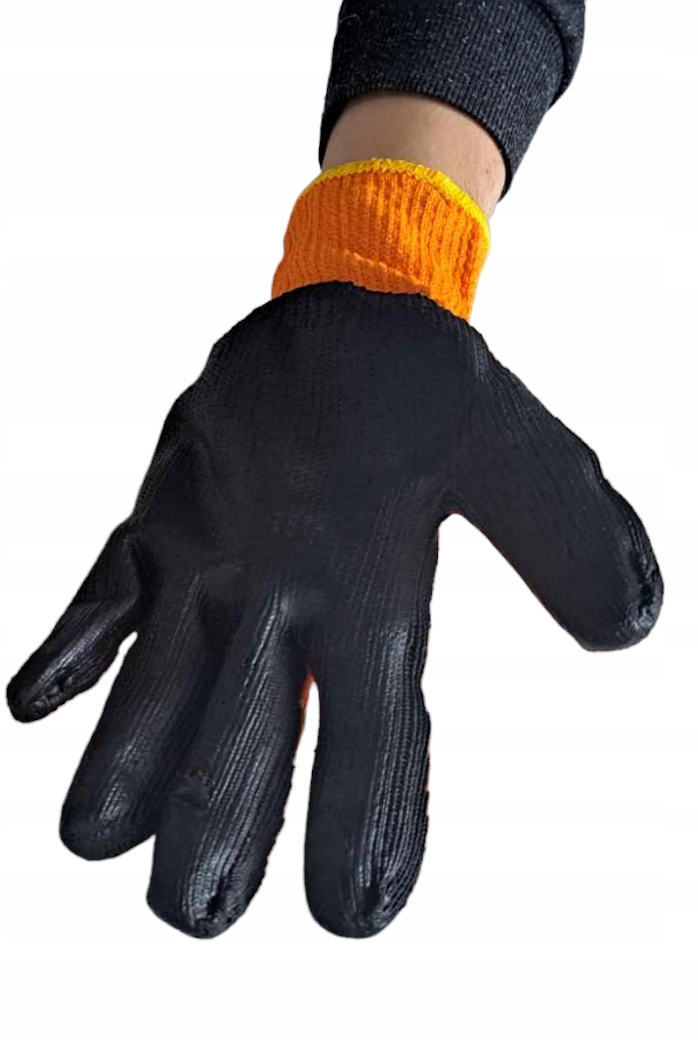 Перчатки рабочие защитные трикотажные полиэстеровые утепленные оранжево-черные с покрытием на ладони грубым черным латексом W100 ECO, 12 пар