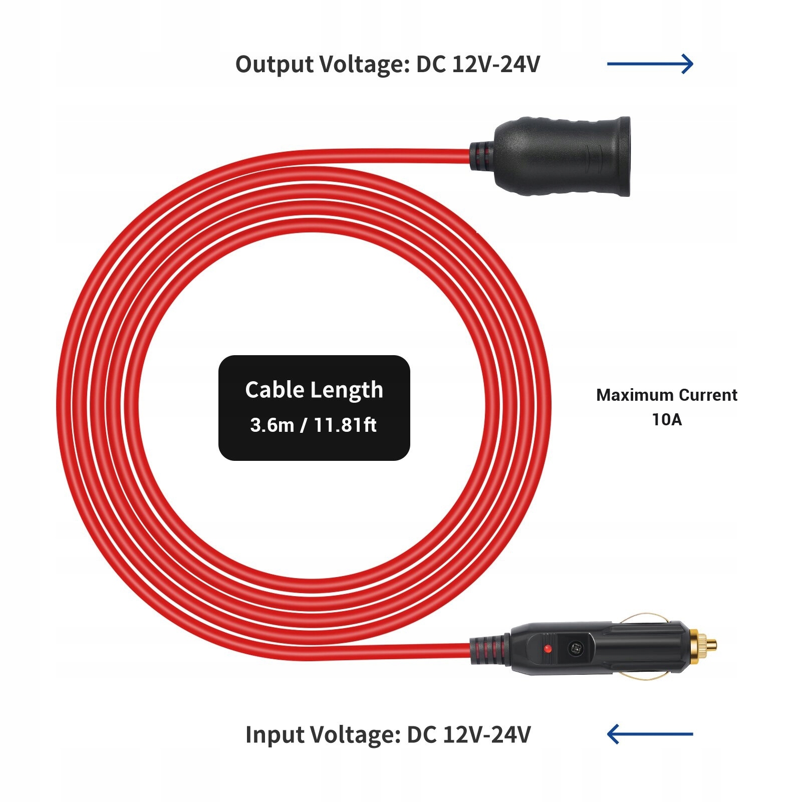 1. Heavy design: 12V LOSTING Cigarette Extensioner is intended for a durability of 12 V, 24 V, with a specification of 18AWG (0.75 mm²) x2 cores and maximum current 15A, suitable for voltage ranges from DC 12V to 24 v.