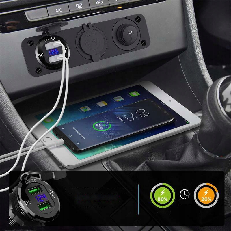 USB CAR Socket QC 3.0 12 В со светодиодным вольтметром, более легким коллектором, независимым выключателем/выключателем схемы, 2 USB -сокеты