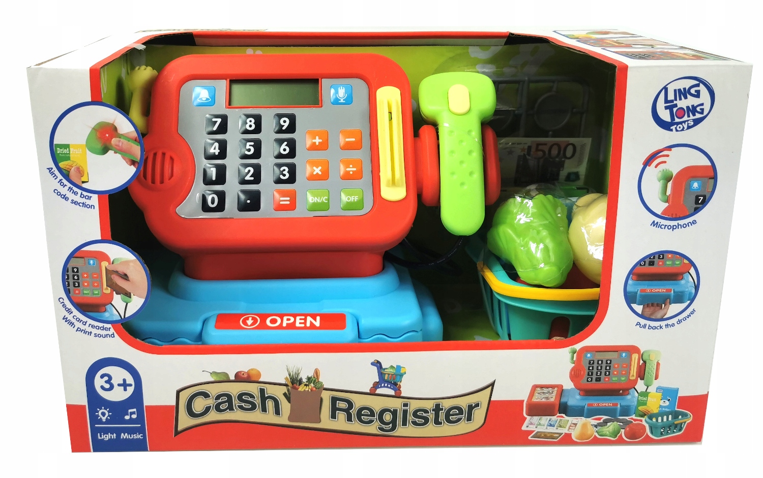 В комплект входит игрушечный кассовый аппарат, напоминающий настоящий магазинный аппарат.
