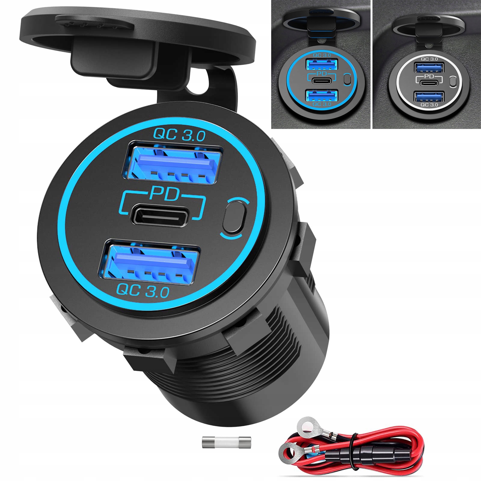 【двойная быстрая зарядка QC 3.0 и PD Тип C】. 12 В USB-сокет с двойной зарядкой QC 3.0 и PD Type C, максимальная мощность USB-C PD, когда он используется в одиночку, составляет 45 Вт или QC3.0 USB 15 W + PD USB-C 20 W + QC3.0 USB 18 века, чтобы контролировать зарядку устройства в любое время, что экономит энергию и защищает устройство. Переключатель может управлять 3 USB -портами и синим светодиодом и эффективно контролировать мощность аккумулятора, не опасаясь его разряда.