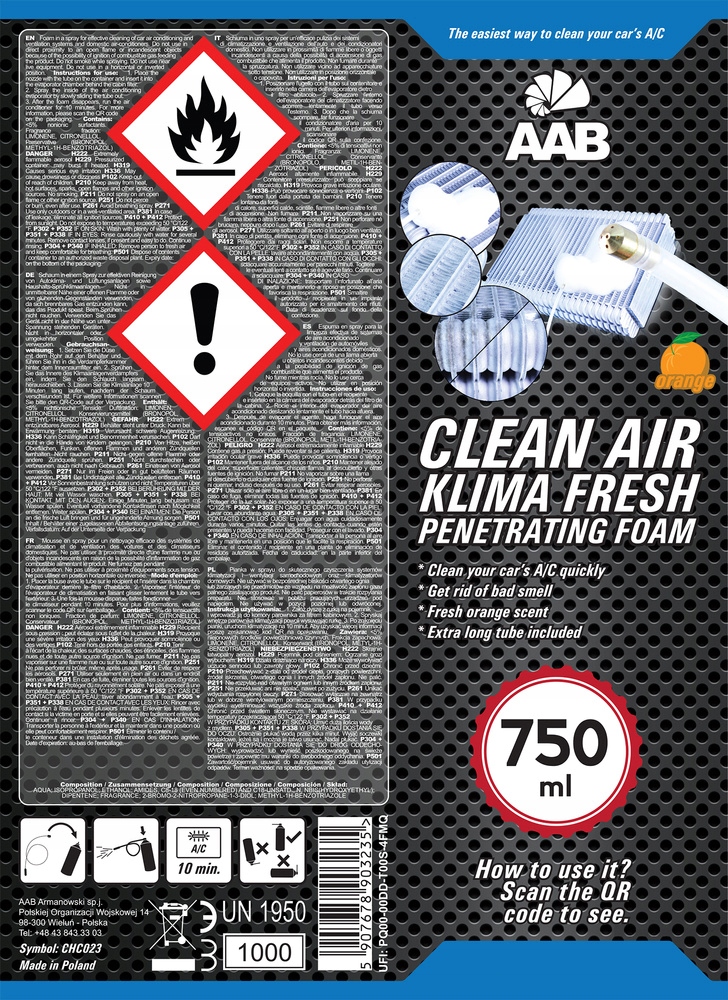 12 x AABCOOLING CLEAN AIR KLIMA FRESH PENETRATING FOAM 750 мл (активная пена) — новейший спрей от AABCOOLING для эффективной очистки автомобильных систем кондиционирования и вентиляции, а также домашних кондиционеров. Улучшенная формула активных ингредиентов эффективно очистит и устранит неприятные запахи, подарив вам и вашим близким невероятную свежесть и чистоту воздуха с оттенком нежного апельсинового аромата. Изделие не оставляет жирных пятен и очень легко чистится.Не откладывайте чистку кондиционера на потом! Начните заботиться о своем здоровье и здоровье своих близких!