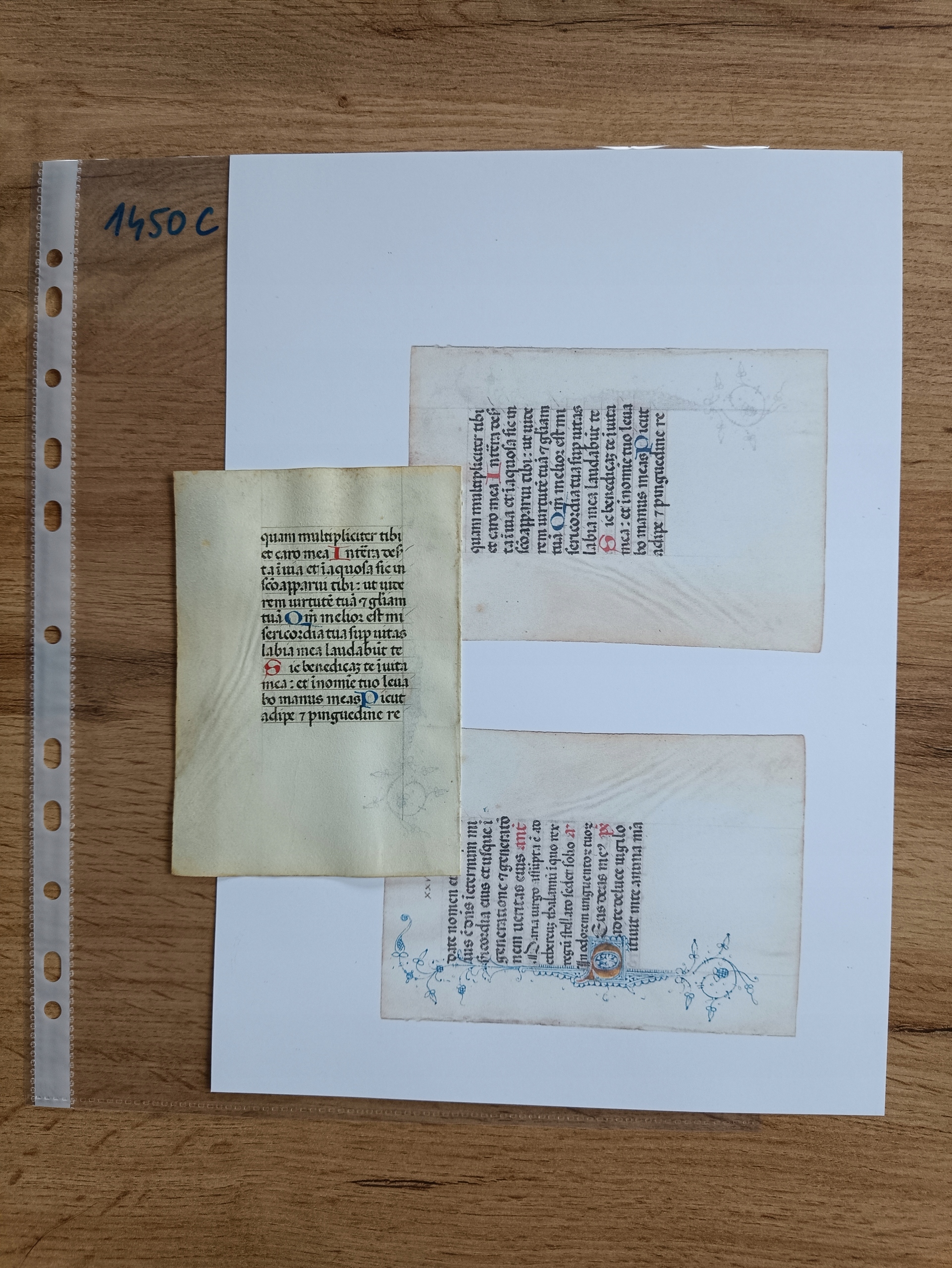 Пергаментная карточка с фрагментом Часослова. Родом она из северной Италии (Ломбардия), около 1450 года. На карточке присутствуют фрагменты 100-го псалма и Марианской молитвы, написанные на латыни типичным для того времени готическим шрифтом на тонком пергаменте. Книга имела удобный формат (размеры карточки примерно 12,9 см х 9,2 см), использовалась для личной молитвы, была предметом роскоши.