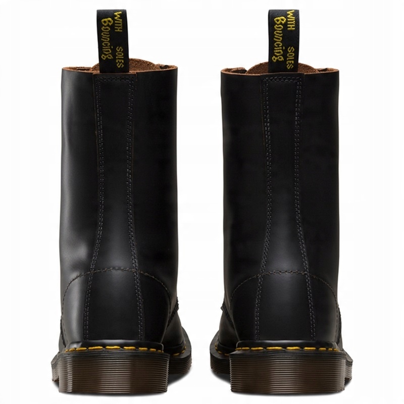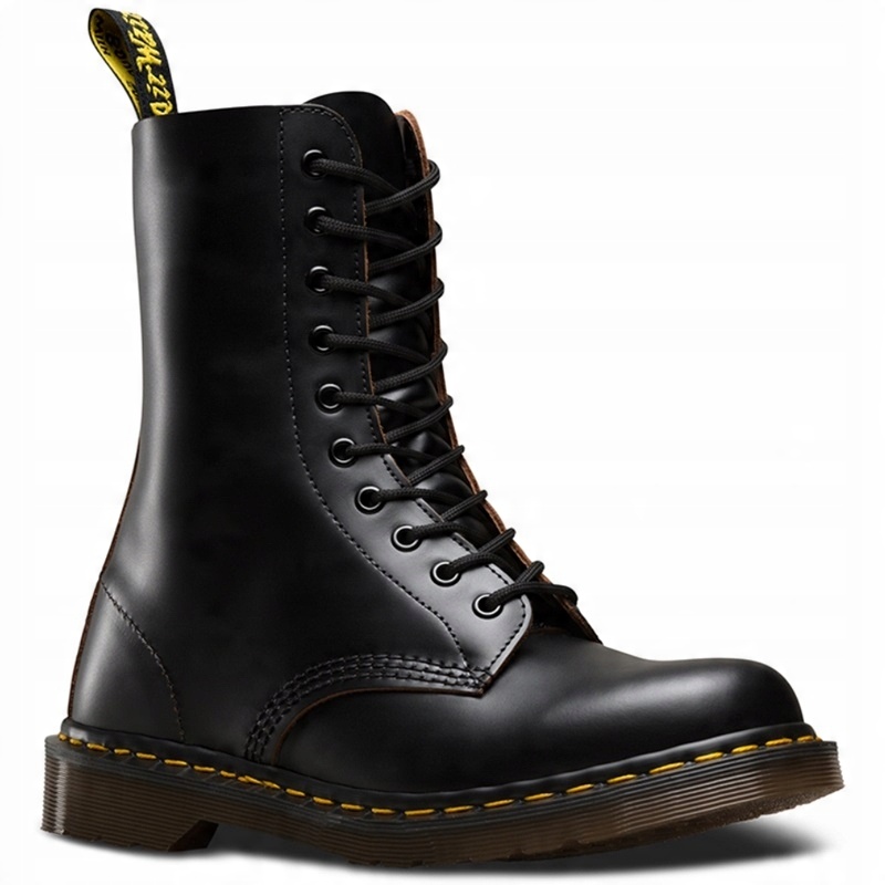 Классическая модель обуви на 10 лунок из коллекции Dr. Док Мартенс. Сделано в Англии. Изготовлен из гладкой натуральной кожи черного цвета. Подошва пришита к верху обуви знаменитой желтой нитью (технология Goodyear Welted). Подошва имеет так называемую характеристику обуви Dr. Martens. подушка безопасности.
