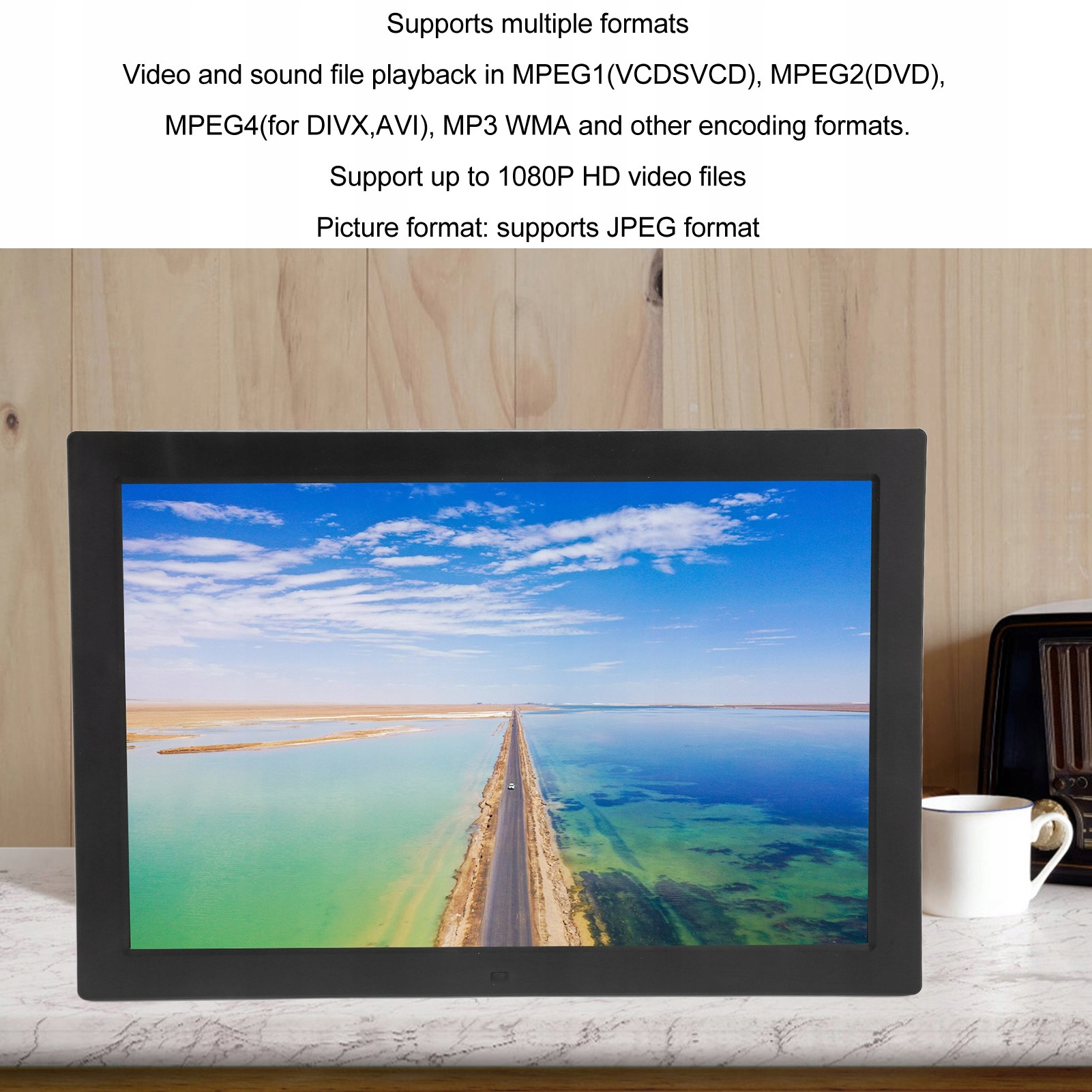 5. Поддержка многих форматов: цифровая фотомодровая кадра поддерживает воспроизведение видео и звуковых файлов в MPEG1 (VCDSVCD), MPEG2 (DVD), MPEG4 (для DIVX, AVI), MP3 WMA и других форматов кодирования, поддерживает видеофайлы HD до 1080 P и поддержка Изображение изображения JPEG