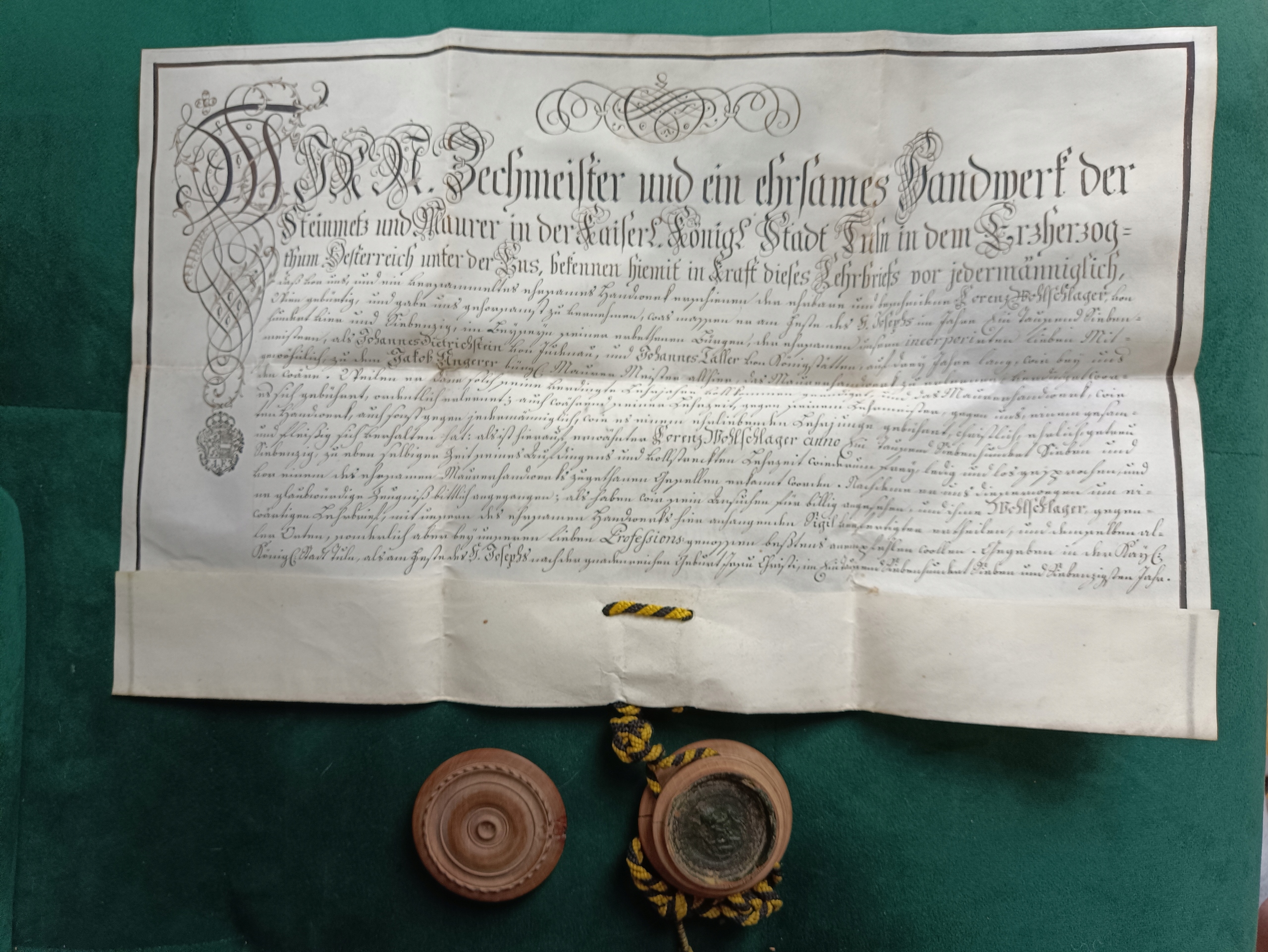 1777 Rękopis Pergamin Cech kamieniarzy i murarzy z pieczęcią