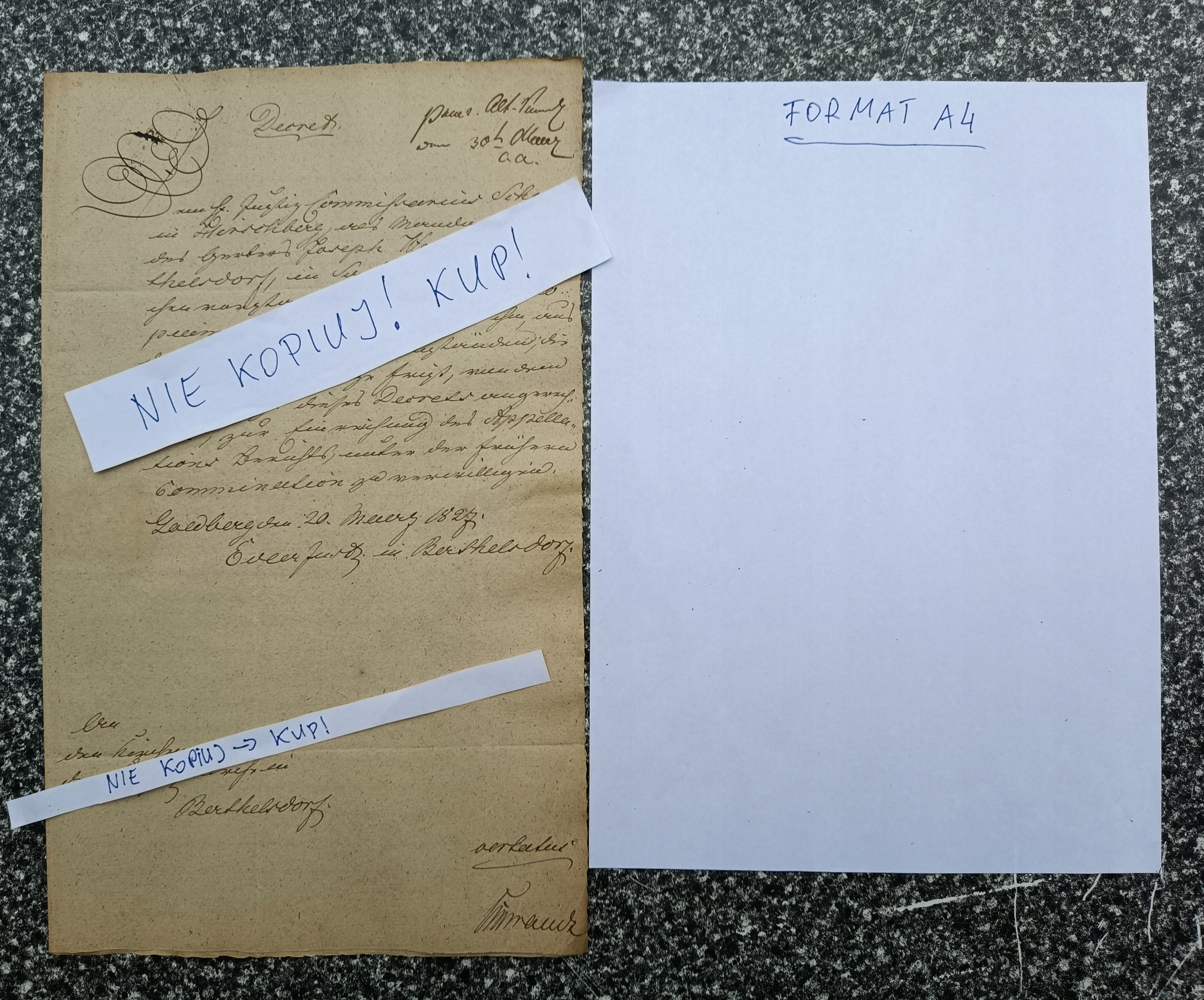 Письмо на немецком языке, написанное 20 марта 1827 года (то есть почти 200 лет назад) в Голдберге - Злойтория (?) И отправлено в Алькемемц - старый дом домов (но должен был поехать в Бертелсдорф - Барсинка). В контенте, на котором есть 3 страницы - на стр. 2-3 мы находим копию постановления комиссара юстиции Шуберта Хиршберга - Джеления Гора относительно определенного Йозефа Вернера из Барцинека. Письмо, принесенное Управлением недвижимости Berthelsdorf (Barcinek) - но почему было написано письмо в Złotoryja? Может быть, владелец или менеджер Barcinka - фон Роткирх, был тогда?