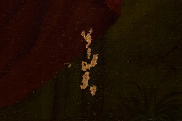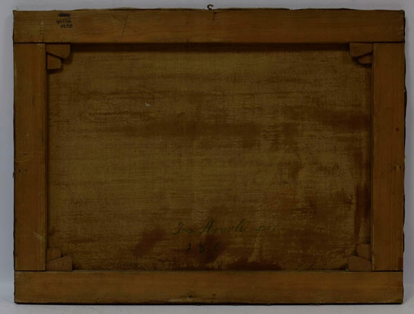 Старая картина маслом, написанная на холсте, помещенная на подрамник, изображающая юную Марию в сопровождении родителей - святых. Анна и Святой Иоахим. Картина подписана «Пин Джоса Арнольда». и датой «1864» на реверсе. На картине имеются потери краски.