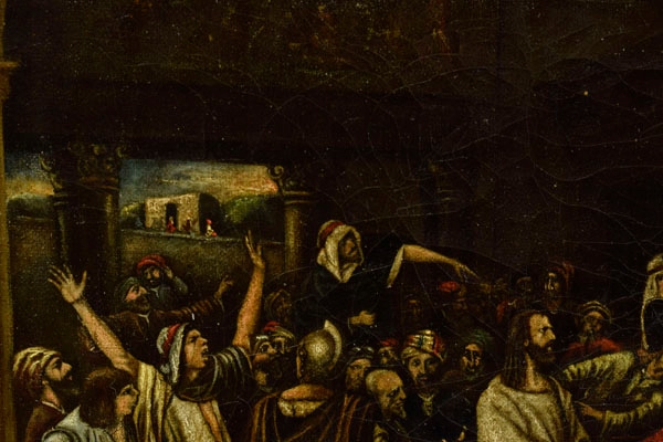 старая масляная живопись, нарисованная на холсте, расположенная на растяжке. Образ представляет библейскую сцену Христа перед Пилатом. На картинке показан внутренняя часть дворца, в котором происходит драматический допрос. Справа, на платформе, Пилат сидит - одетый в яркие одежды римского губернатора, в окружении советников и охранника. В середине композиции есть Христос - спокойный, одетый в простую тунику, с его руками. Люди поднимают руки, указывают, кричат - требуя осуждения. Некоторые солдаты держат Спирс, другие жестоко жестикулируют, подчеркивая напряжение момента. Сцена ослаблена драматически: свет выявляет лицо Христа, Пилата и центральных персонажей, оставляя остальных в тени. Все показывает момент, определяющий судьбу Иисуса, полная напряженности и драмы. Изображение. h1> Изображение изображения хорошо видимо на картинках, мы приглашаем вас просмотреть прикрепленные фотографии. h1> Размеры с кадром: h1> 48,5 x 40 см h1> Прикрепленные фотографии являются неотъемлемой частью описания изображения.