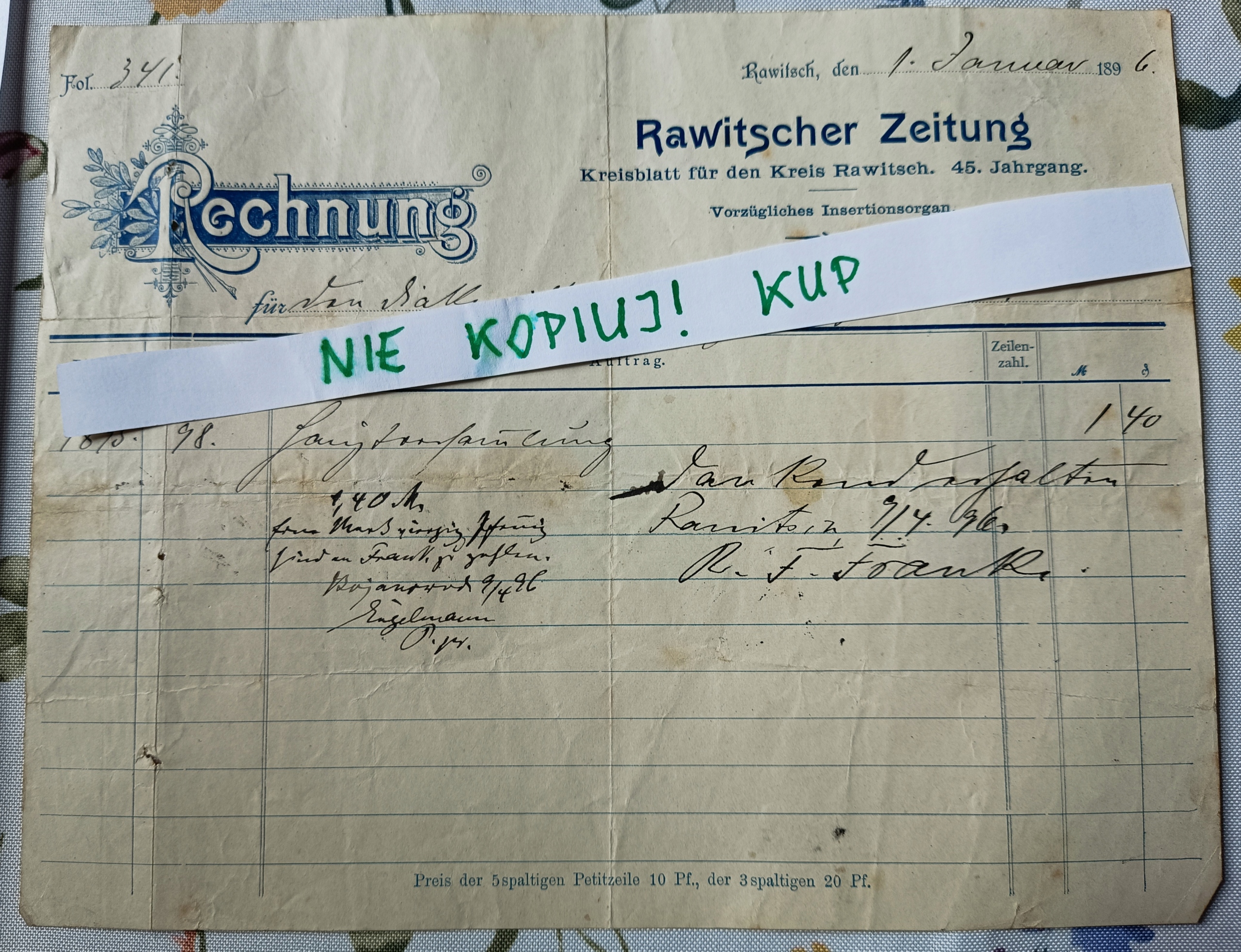 Аккаунт 1896 года от Rawicz - Rawitcher Zeitung - Gazeta Rawicka - для Rawicki Poviat.