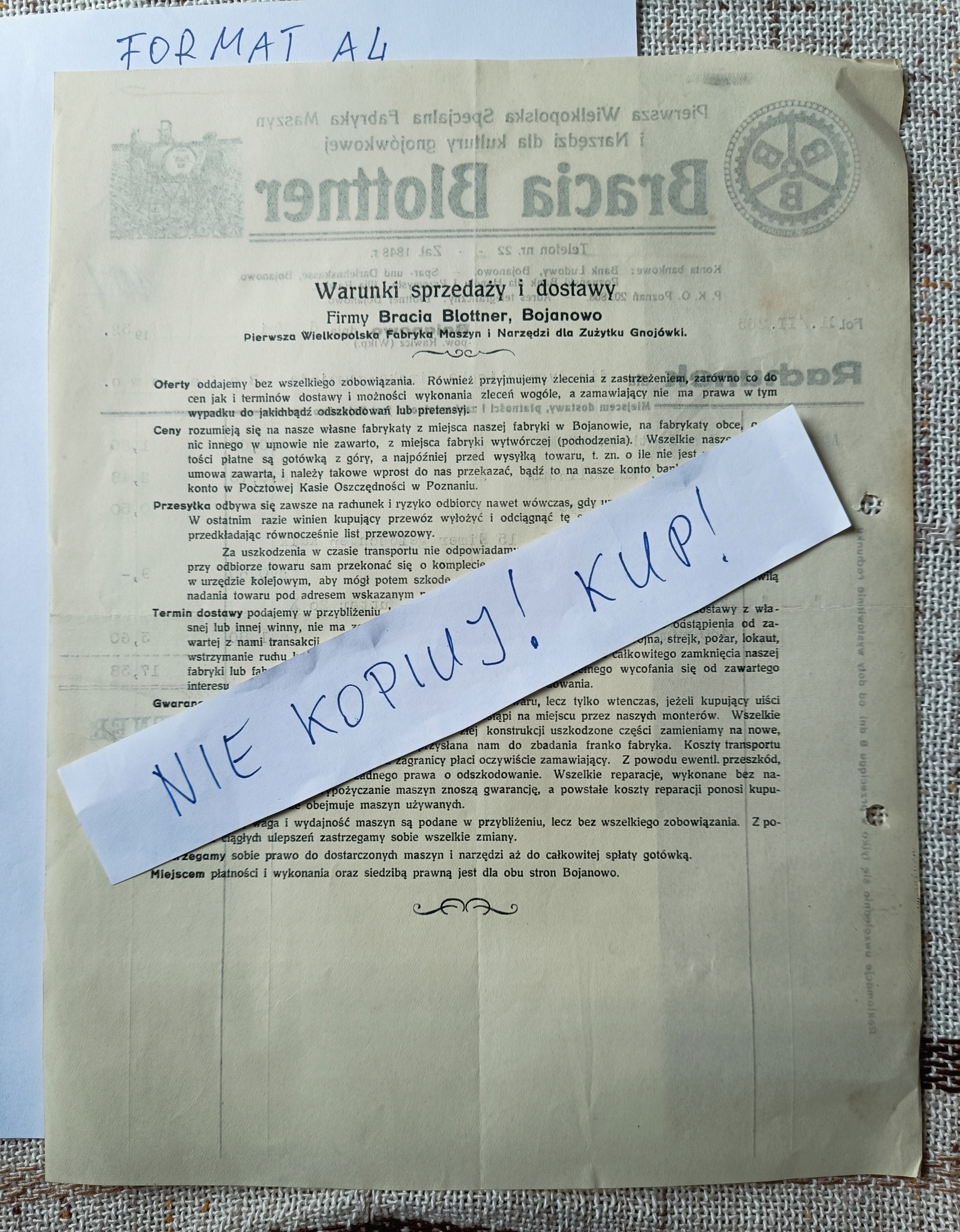 Компанский счет о первой фабрике специальной машины Wielkopolska и инструментах для культуры культуры Gnojów из Bojanów. 1932, прекрасная виньетка с логотипом - x 3 B. Заводская марка, а на обороте условия продаж и доставку, приобретенные на законных основаниях (квитанция, которую мы выпускаем из кассового регистра, также является таким доказательством - если кто -то хочет оставаться анонимным для налоговых услуг, которые имеют право осматривать мои счета в течение 6 лет). Это также является доказательством того, что причитающиеся налоги были уплачены (вам не нужно платить PCC - при покупке, если они превышают 1000 PLN). покупка. экспонаты. Например: решающий, кто подписал письмо, чье герб герметизируется - он неоднократно увеличивает значение рукописи - ранее анонимно ... значение, купленное у нас с описанием, украсит каждую коллекцию ...
