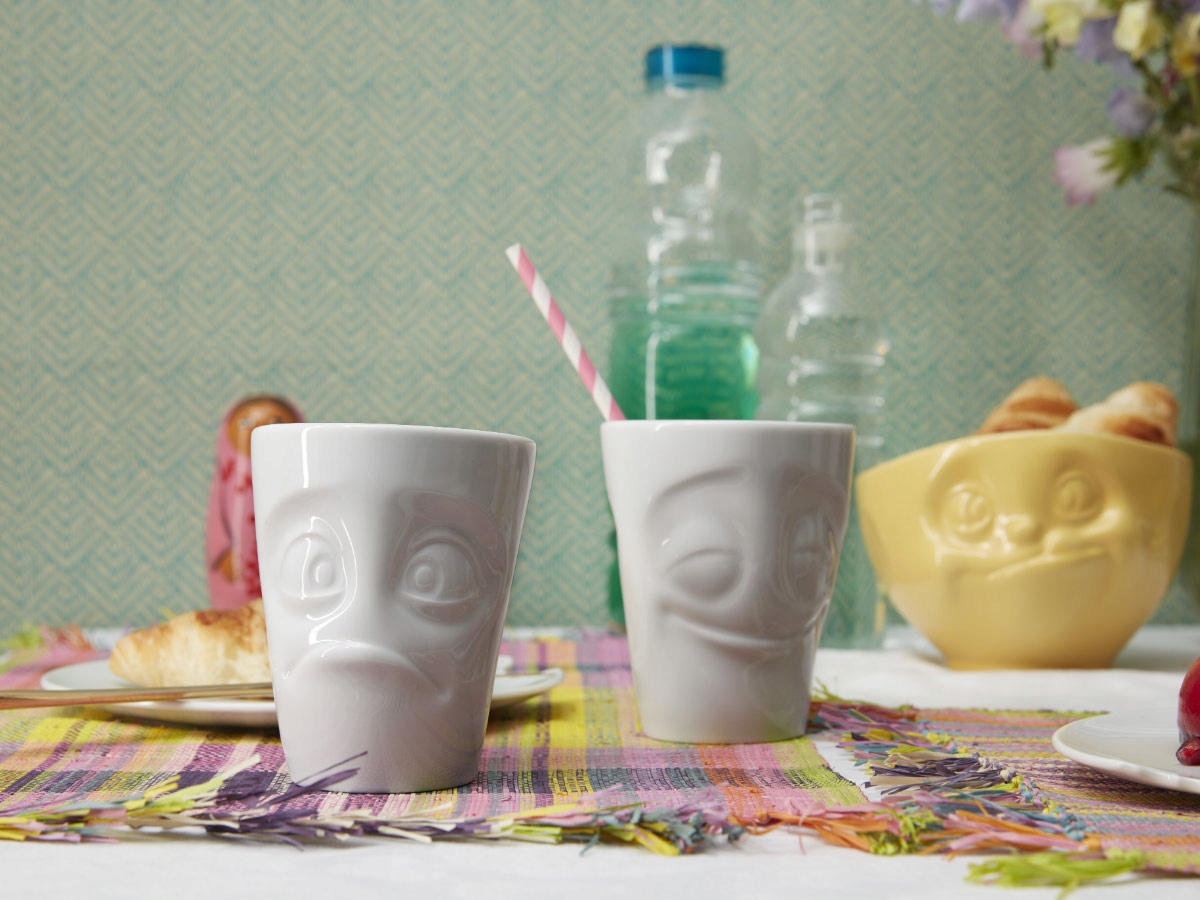 Набор оригинальных чашек украшен трехмерным мотивом улыбающегося и грустного лица. Первоначальный внешний вид привлекает внимание. Изготовлен из высококачественного фарфора, дополнительно усиленного по краям. Благодаря этому они чрезвычайно сильны и долговечны Преимущества продукта: