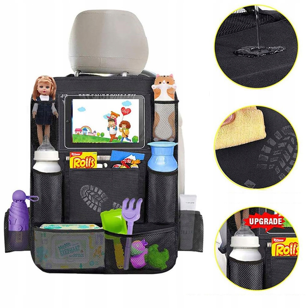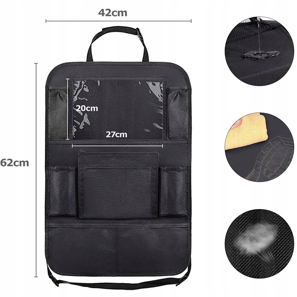 ❇ ❇ Особенности: Высокая емкость: Автомобильный органайзер для заднего сиденья, размер которого увеличивается до 62 x 42 см; Прозрачное окно имеет площадь 27 х 20 см, что облегчает хранение iPad или планшет. Таким образом, благодаря планшету, люди на заднем сиденье могут насладиться счастливым временем. Сумка на спинке с 10 отсеками для хранения предоставляет больше места для хранения напитков, игрушек для детей, книг и журналов, благодаря тому, что путешествие становится проще и приятным