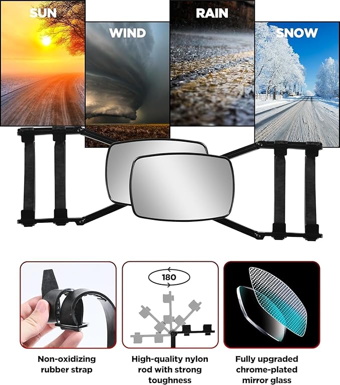 - Простота установки: легко устанавливать и снимать. Просто прикрепите универсальный зажим для удлинения зеркала прицепа. Кроме того, буксировочное зеркало подходит для большинства транспортных средств, таких как внедорожник, кемпер, фургон, грузовик, кемпер, автомобиль и т. д.