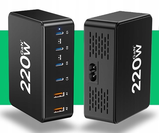 Адаптер быстрого питания – это 6-портовое зарядное устройство GaN USB C общей выходной мощностью 220 Вт, позволяющее быстро и эффективно заряжать устройства. Использование одного порта USB C1/C2/C3 с максимальной выходной мощностью до 100 Вт позволяет быстро заправить даже мощные ноутбуки.