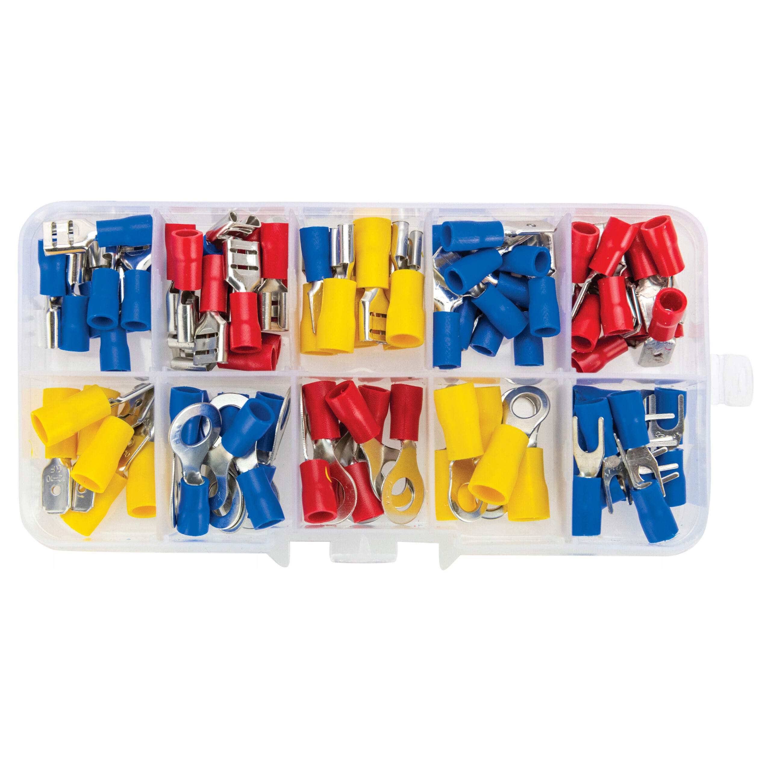 Набор из 120 изолированных клеммных соединителей. В комплект входят 10 типов разъемов, рассортированных по отдельным отсекам. Удобный компактный корпус с отделениями предотвращает перепутывание разъемов. Все отсеки корпуса промаркированы, что облегчает поиск нужного разъема. Разъемы предотвращают чрезмерный изгиб проводов и их коррозию, обеспечивают хорошую изоляцию.